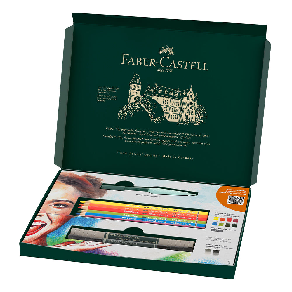 Extensive watercolour set with 12 pieces: includes 8 Albrecht Dürer watercolour pencils, 2 watercolour markers, 1 graphite watercolour drawing pencil and 1 water tank brush